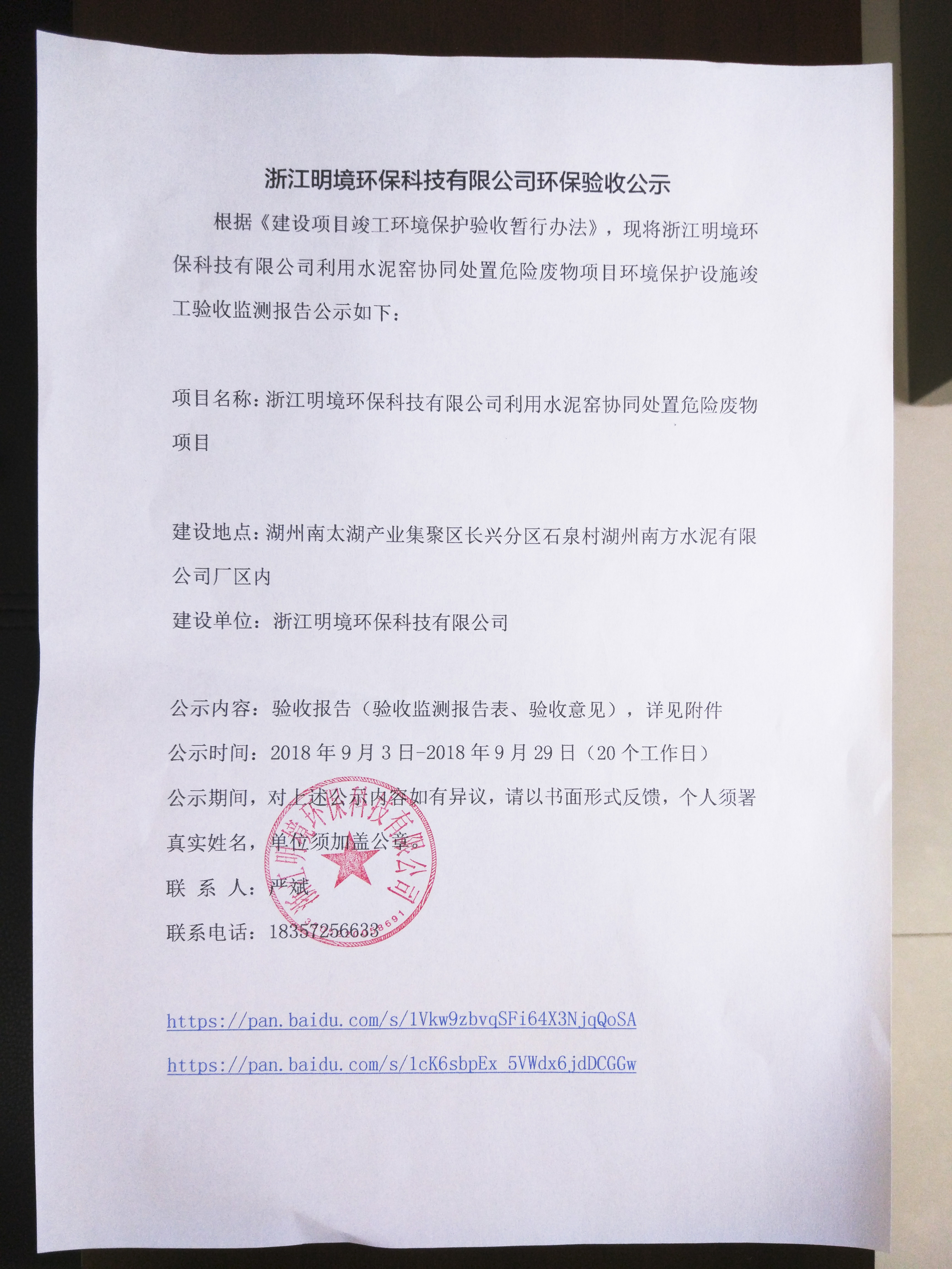 根據(jù)《建設項目竣工環(huán)境保護驗收暫行辦法》,現(xiàn)將浙江明境環(huán)保科技有限公司利用水泥窯協(xié)同處置危險廢物項目環(huán)境保護設施竣工驗收監(jiān)測報告公示如下: