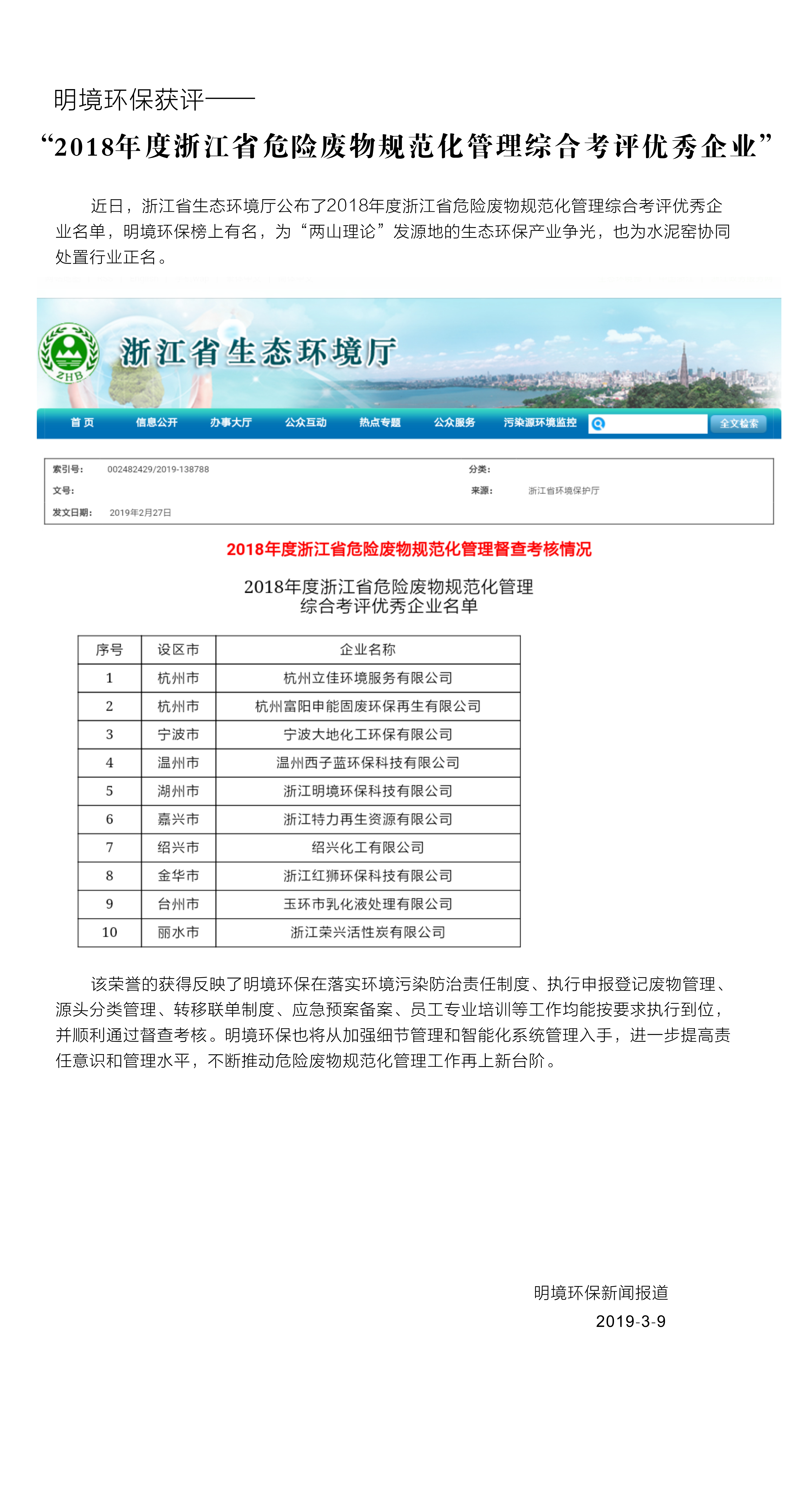 明境環(huán)保獲評“2018年度浙江省危險廢物規(guī)范化管理綜合考評優(yōu)秀企業(yè)”
